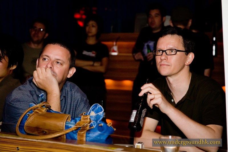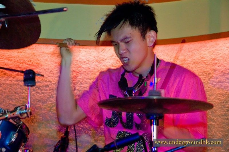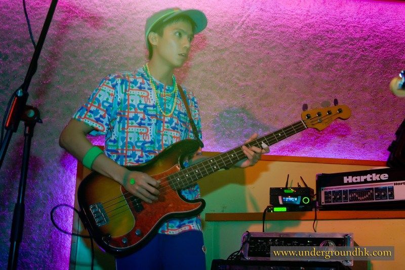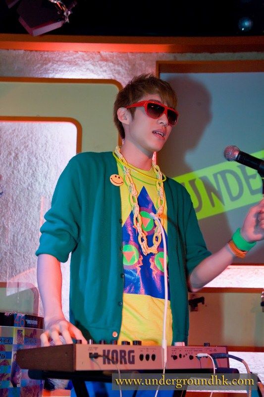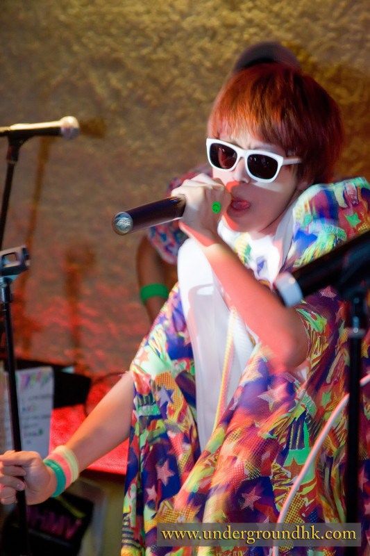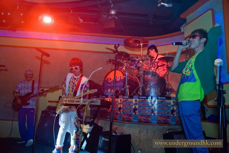 The Yours turned up dressed to impress. Crazy oversized sunglasses, an amazing technicolour dreamcoat and fresh coiffures: the hair salons in Central must have been busy that afternoon. They launched into the set with two numbers based around keyboards, guitar, bass and drums, fast and bouncy. The first was something about mobile phones as far as I could tell, the second was like the B52s on crack. Really.